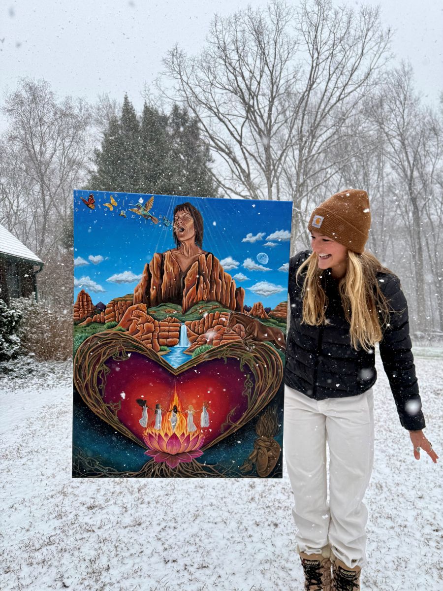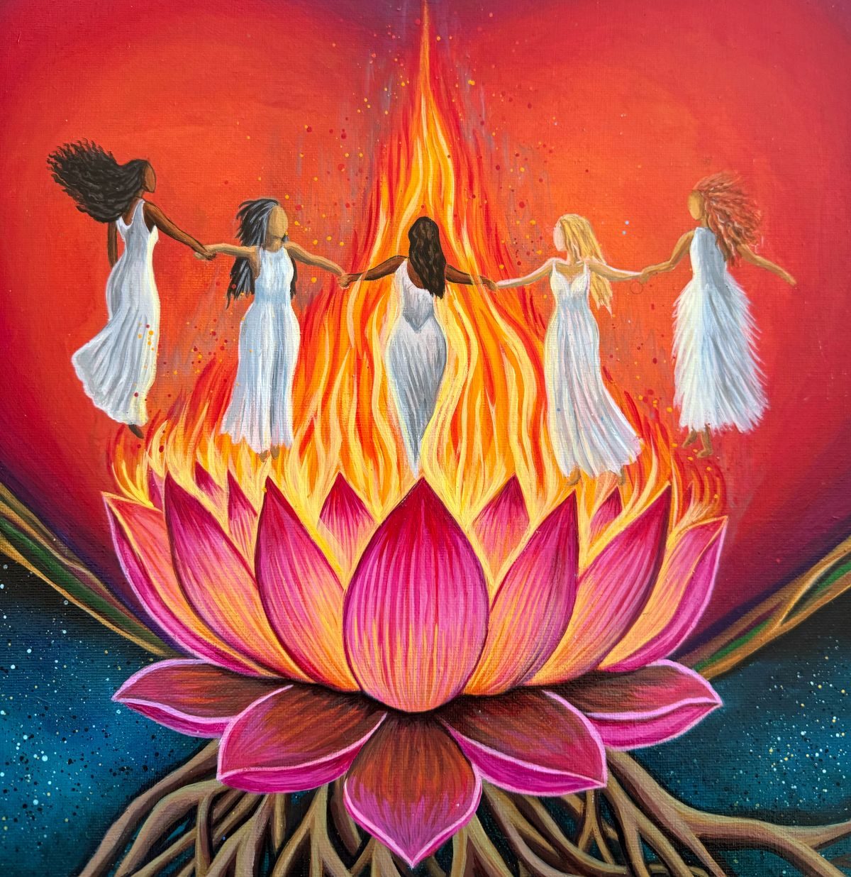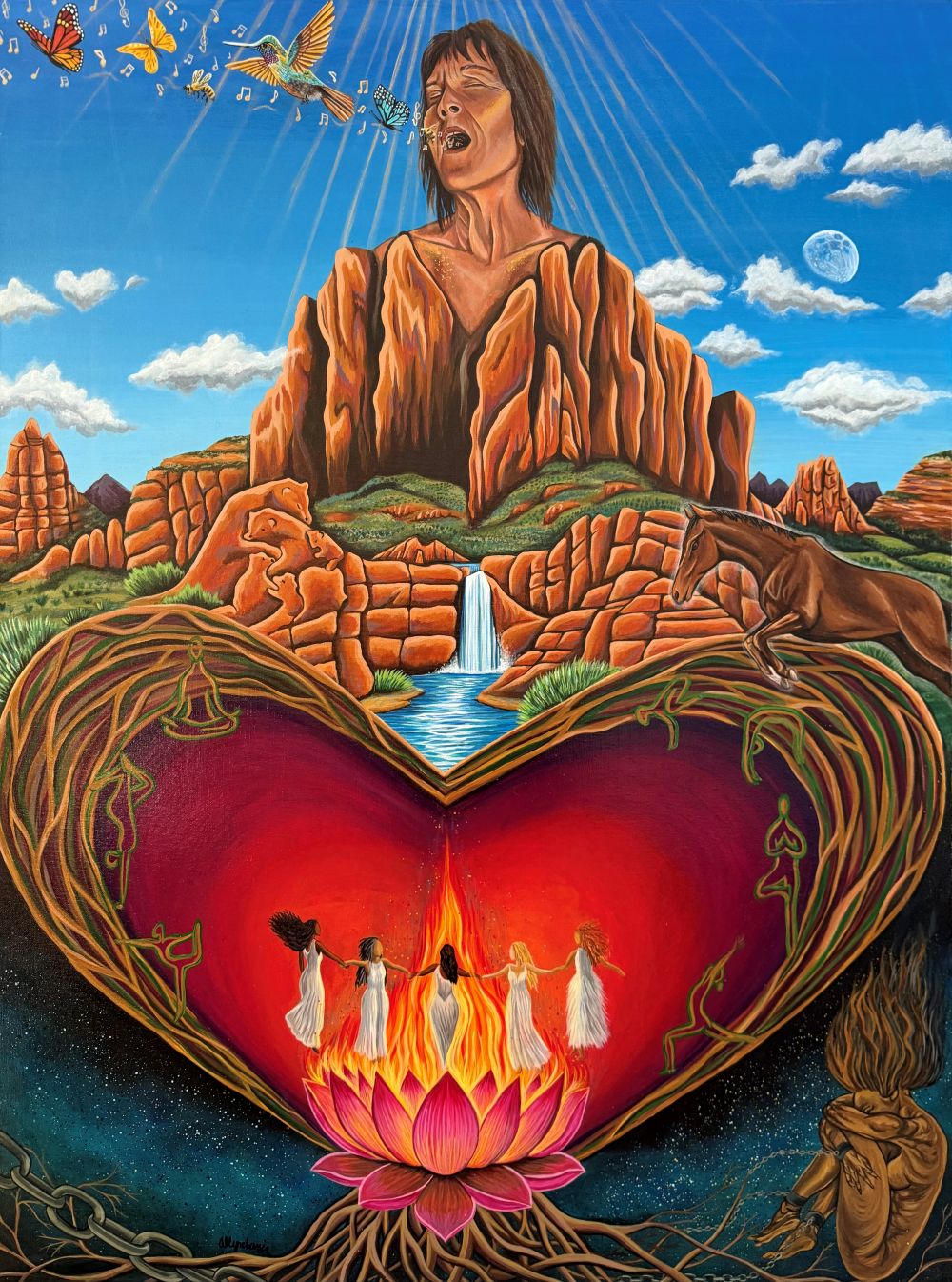 "A Song of Joy" is a visual story of the soul’s journey - from struggle to transformation and ultimate joy. At the bottom, a figure sits in despair, entangled in roots, symbolizing hardship and suffering. From the mud, a vibrant lotus blooms, giving rise to a heart-shaped sanctuary where women dance around a sacred fire, embodying healing and connection. Above, a south western landscape emerges, with a waterfall flowing from the heart. At its peak, a figure sings, releasing music, butterflies, and birds into the sky; an expression of liberation and pure joy. This painting is a testament to resilience, growth, and the beauty of the soul’s evolution.
