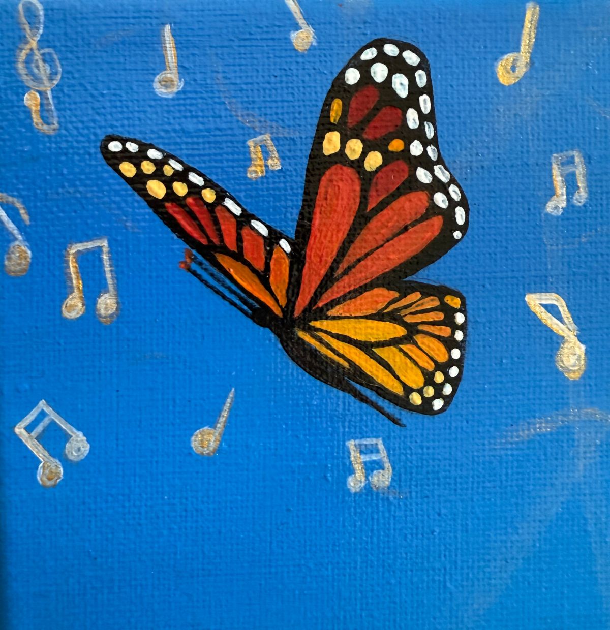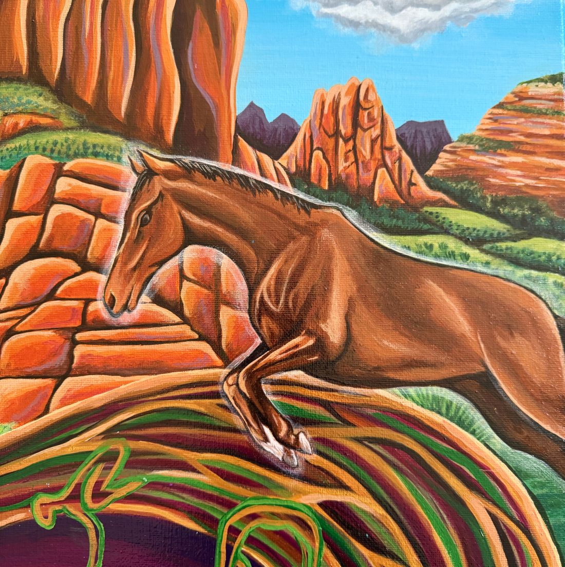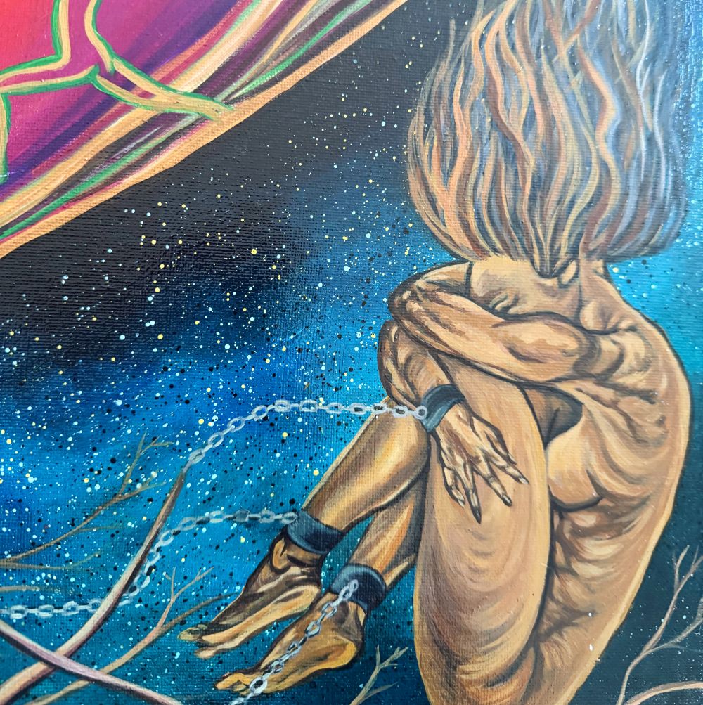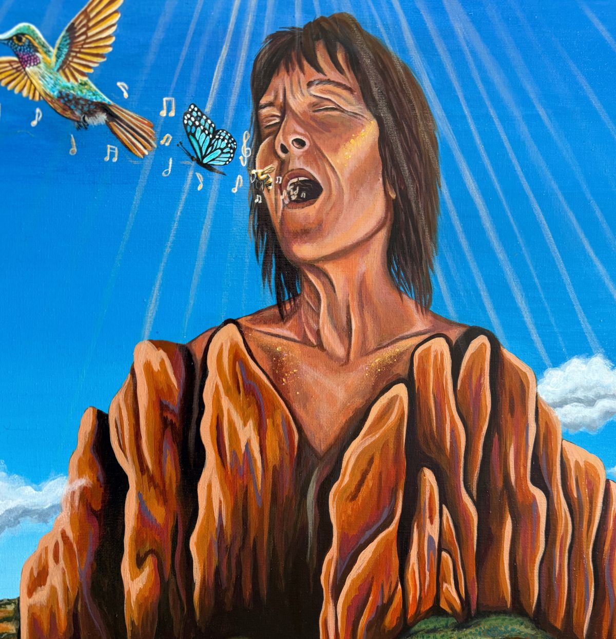 "A Song of Joy" is a visual story of the soul’s journey - from struggle to transformation and ultimate joy. At the bottom, a figure sits in despair, entangled in roots, symbolizing hardship and suffering. From the mud, a vibrant lotus blooms, giving rise to a heart-shaped sanctuary where women dance around a sacred fire, embodying healing and connection. Above, a south western landscape emerges, with a waterfall flowing from the heart. At its peak, a figure sings, releasing music, butterflies, and birds into the sky; an expression of liberation and pure joy. This painting is a testament to resilience, growth, and the beauty of the soul’s evolution.