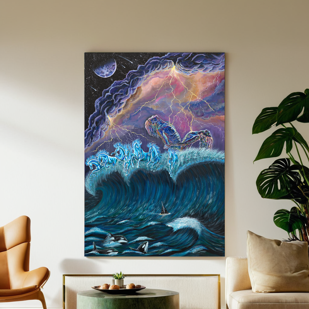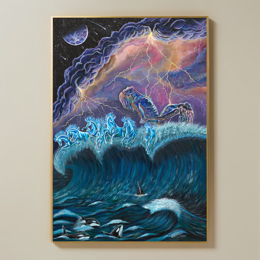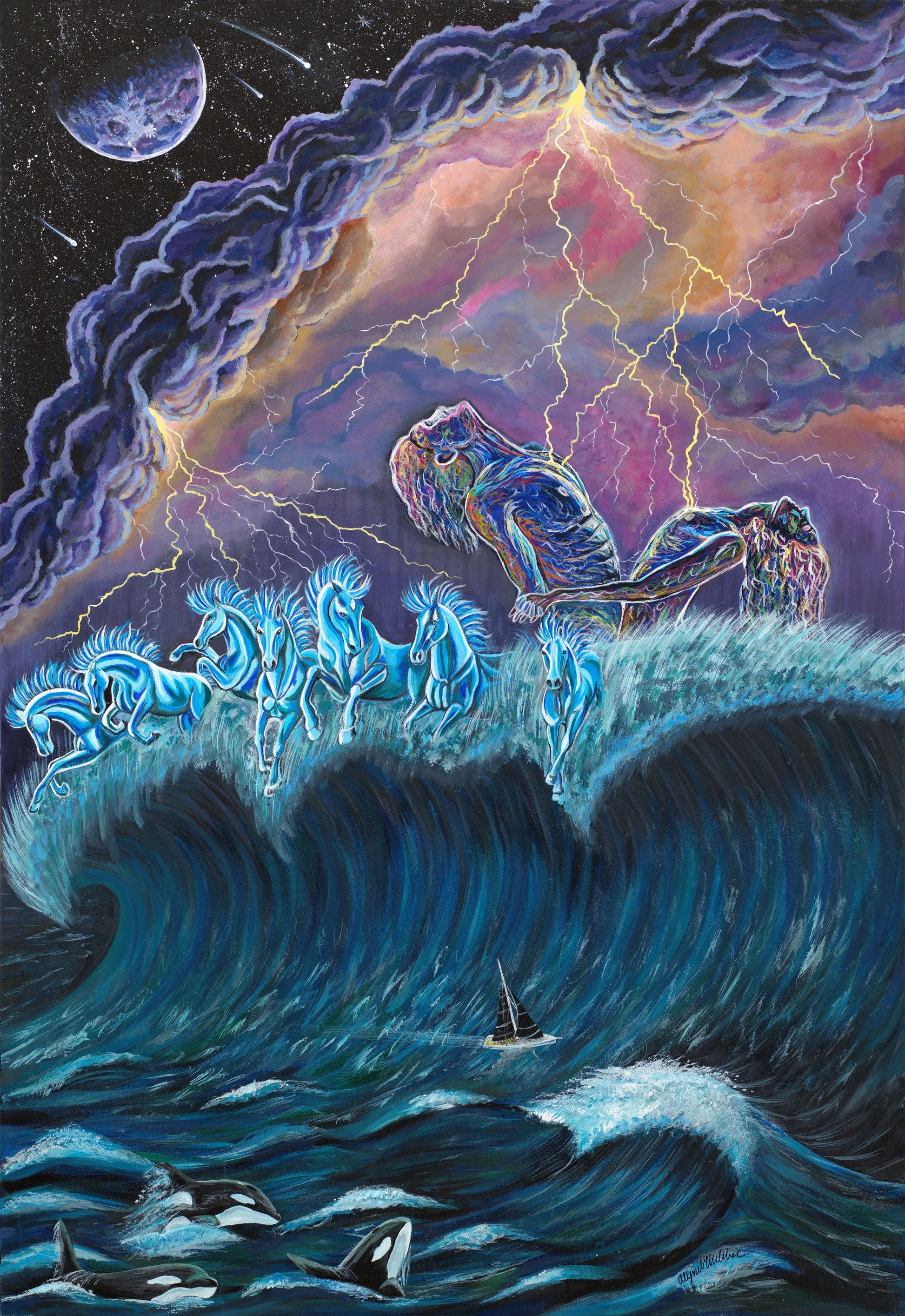 Electrostatic Love captures the raw intensity of cosmic energy and divine connection. In this dynamic painting, an electric storm pulses through the sky, while a powerful wave of energy rises from the ocean. A pair of intertwined figures emerge, representing unity and love amidst chaos. Surrounding them, ethereal blue horses gallop through the crashing wave, symbolizing freedom and strength. Orcas swim beneath the turbulent sea, further adding to the sense of balance between elemental forces. This electrifying artwork embodies the beauty of love's power to endure and thrive in the face of adversity.