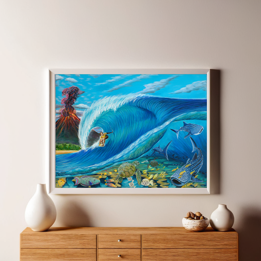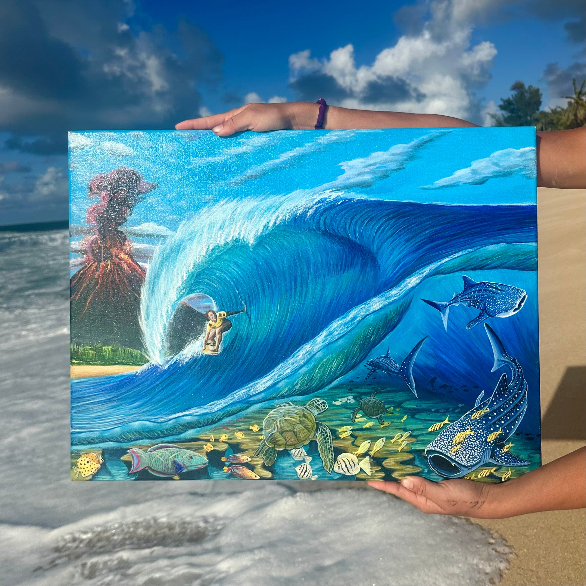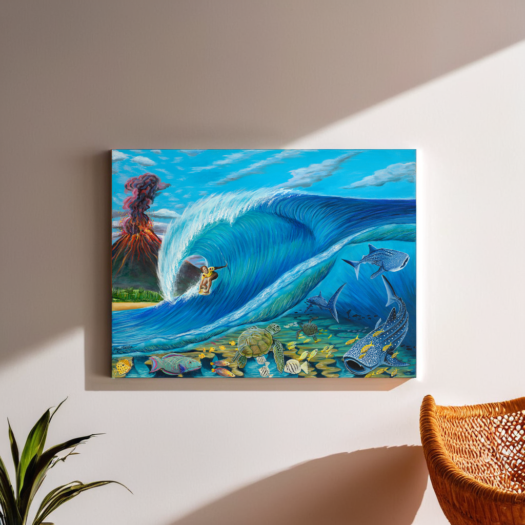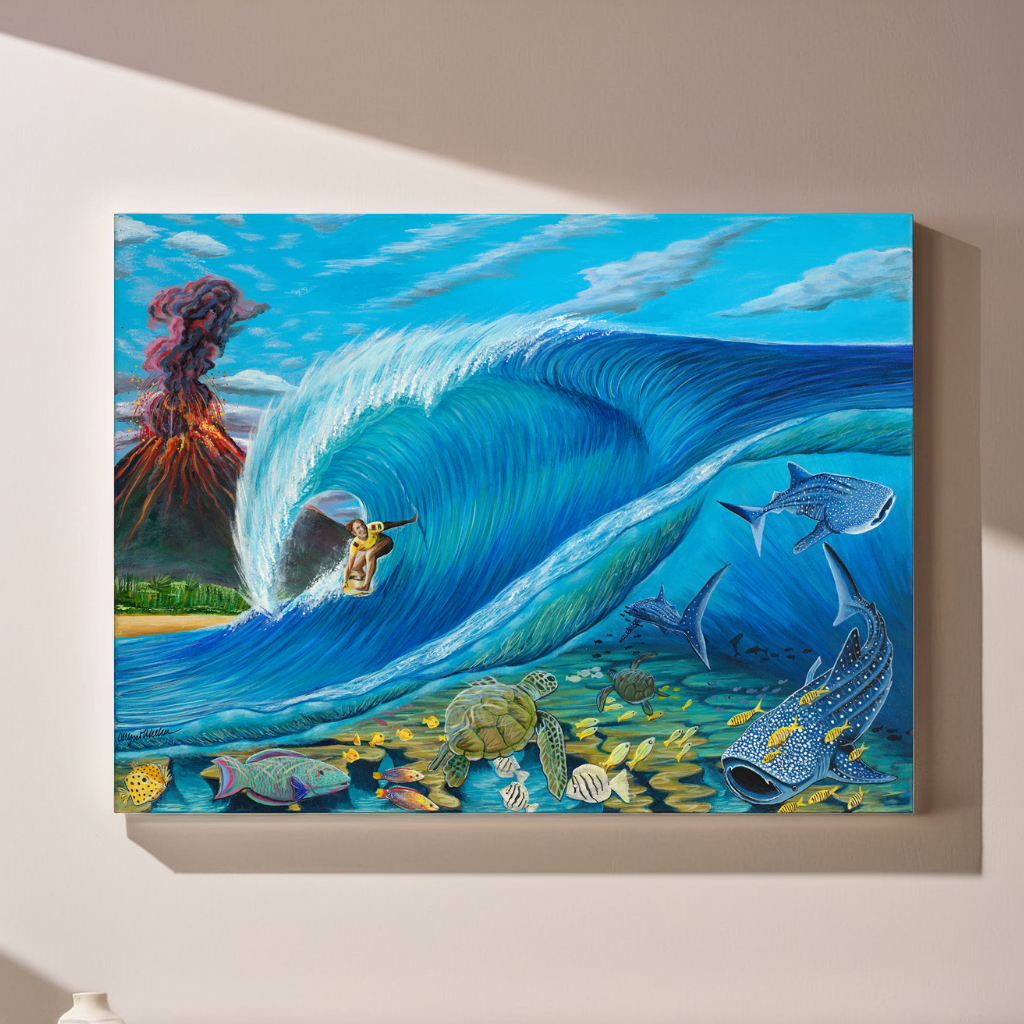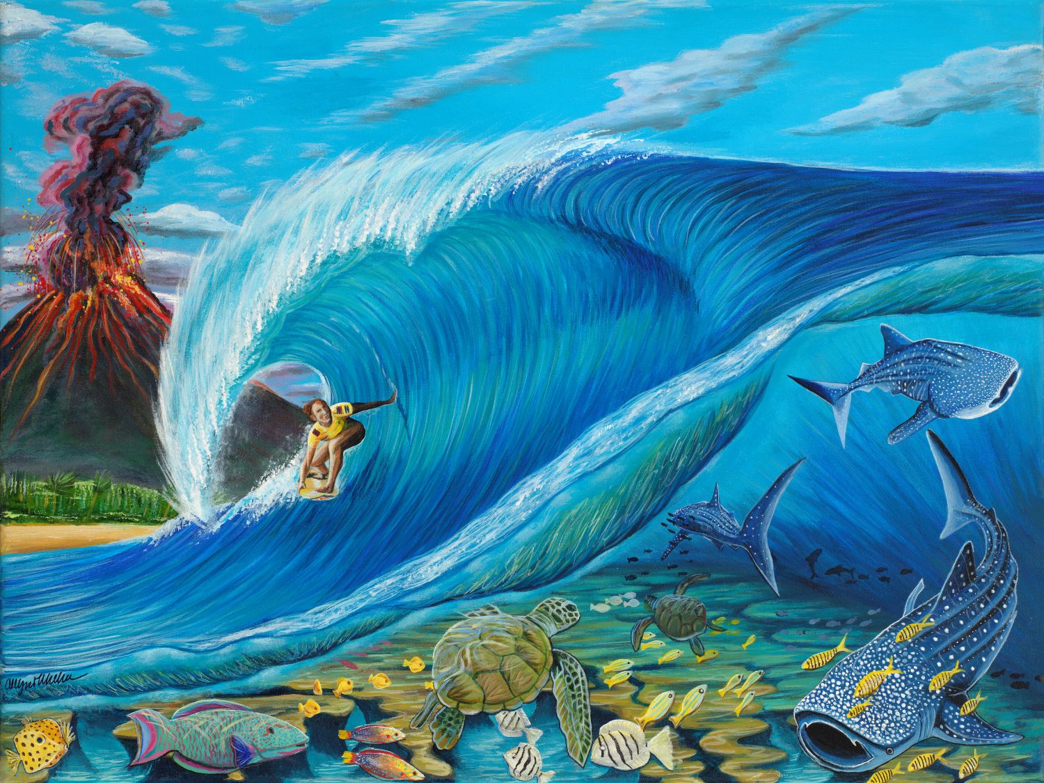 Makua to Makai - Fire and Flow depicts a surfer riding a massive wave, with a volcanic eruption in the background. Below the surface, sea life thrives, including turtles and whale sharks. This vibrant artwork highlights the powerful connection between humans and nature, showcasing the harmony between fire and ocean.