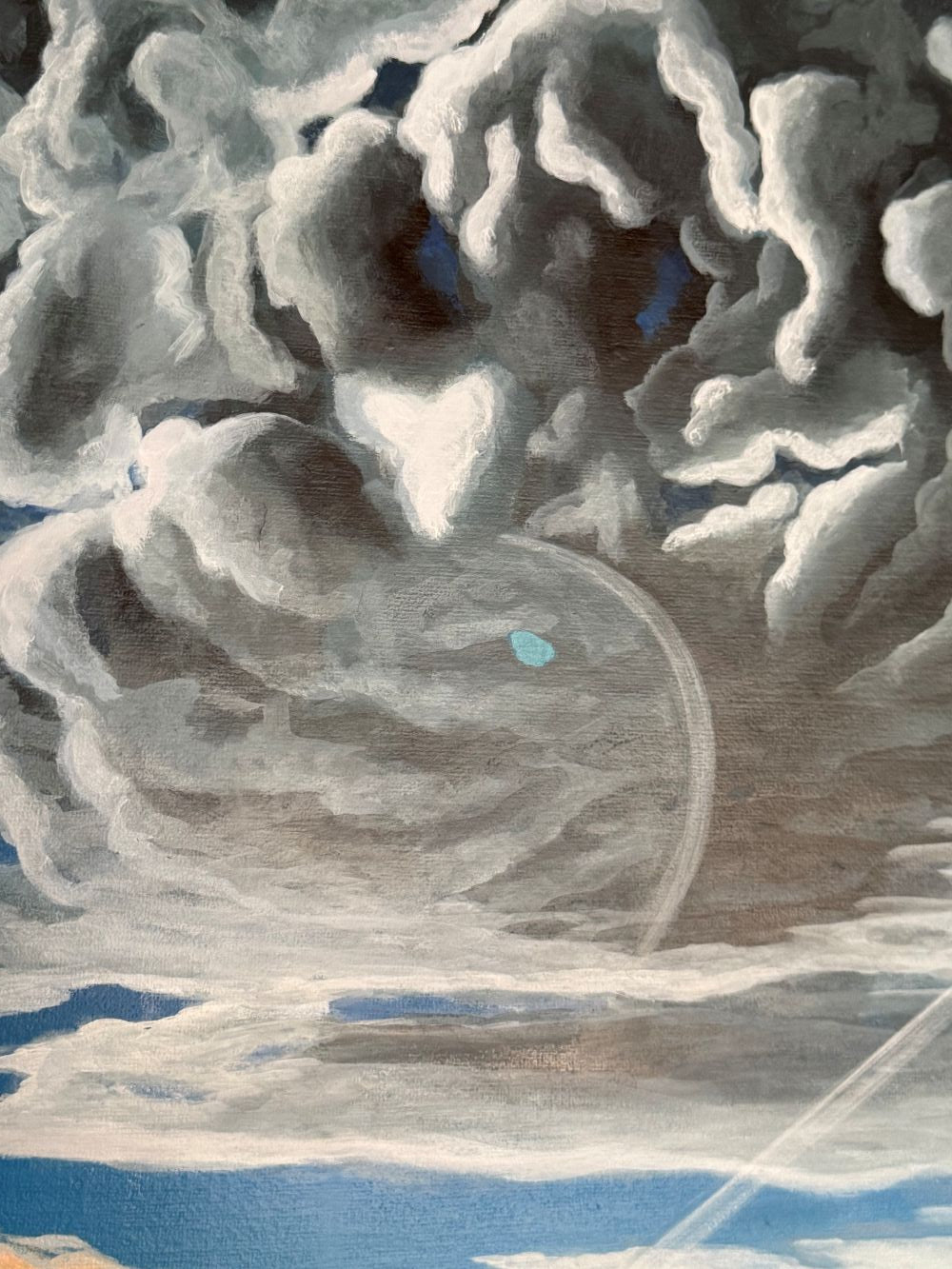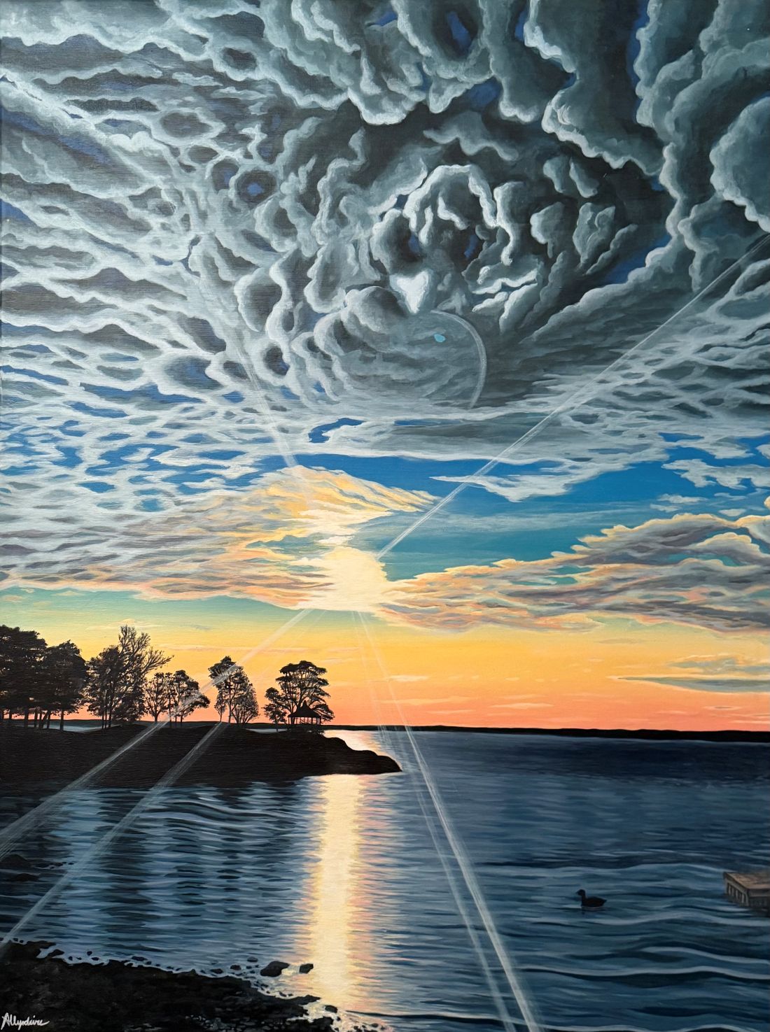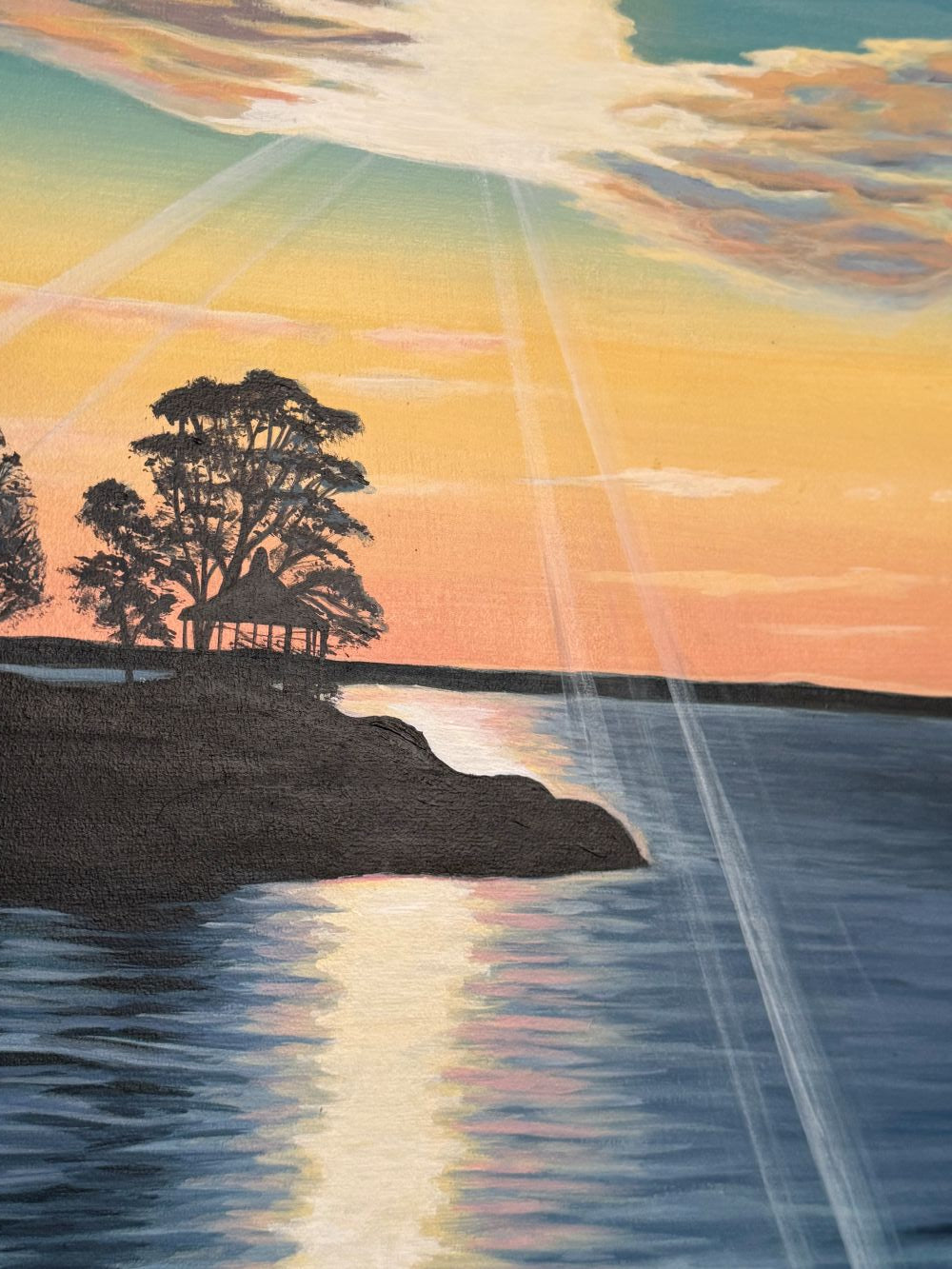 This painting is a sunset from a special moment in the client's life, with an added magical touch to the clouds and lighting.