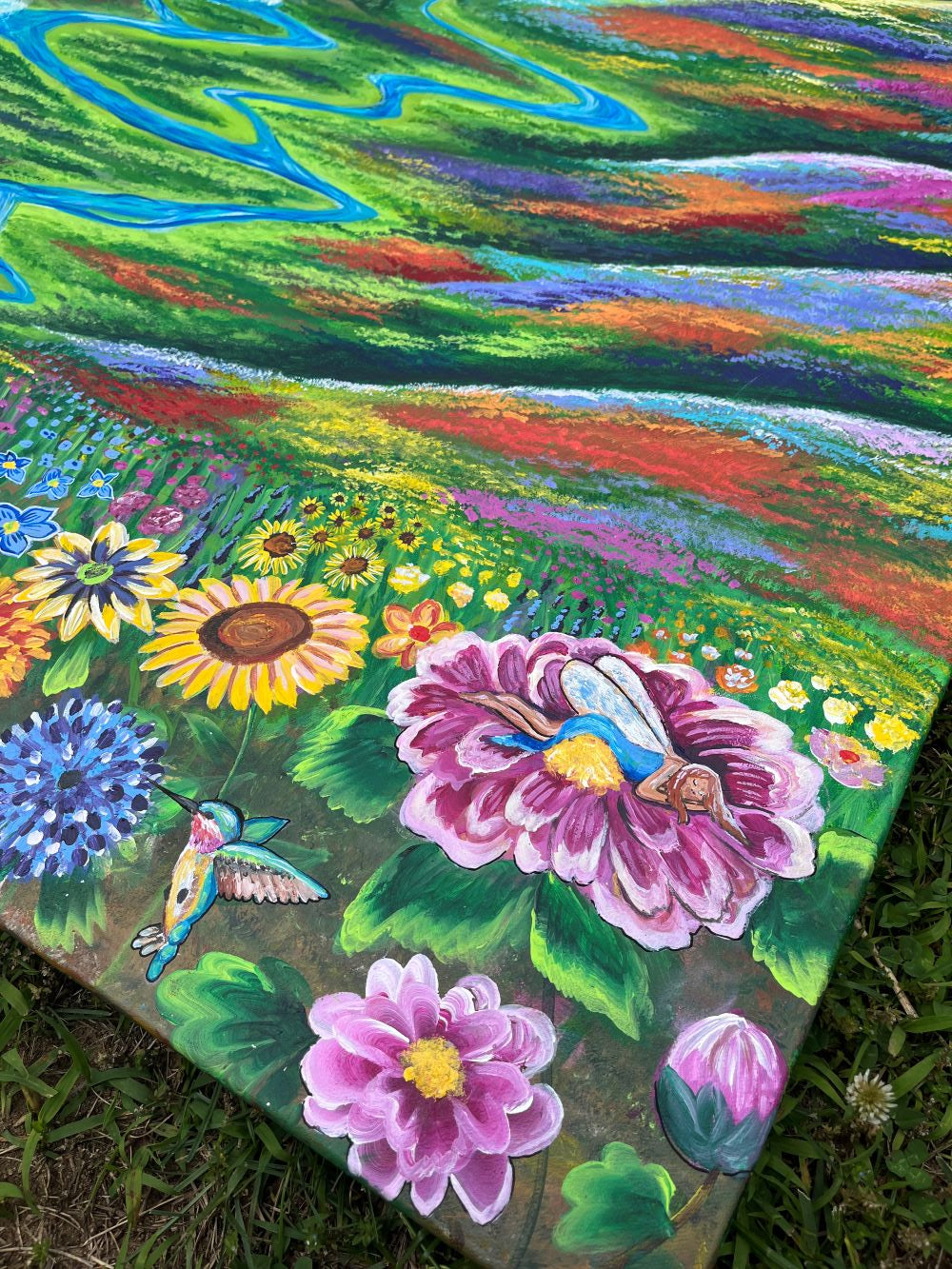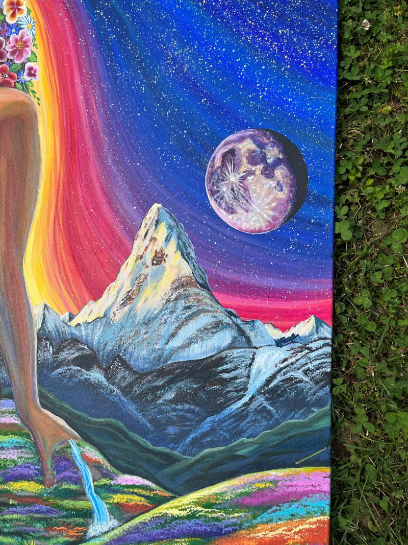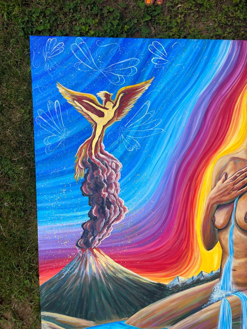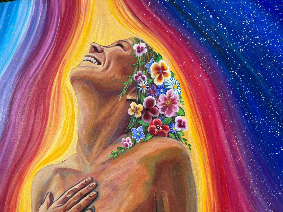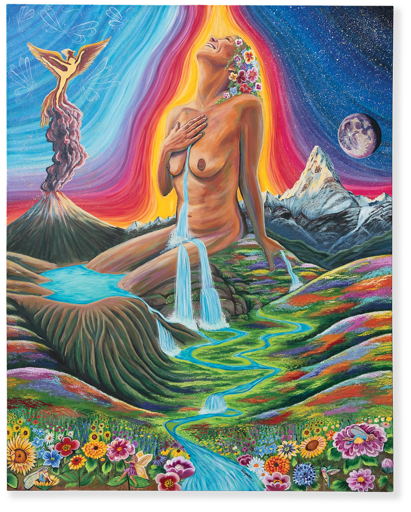 River of Love is a soul painting that represents transformation, divine feminine energy, and spiritual connection. A woman sits peacefully amidst waterfalls and blooming flowers, while an angel soars above, symbolizing guidance and renewal through the eternal flow of love.