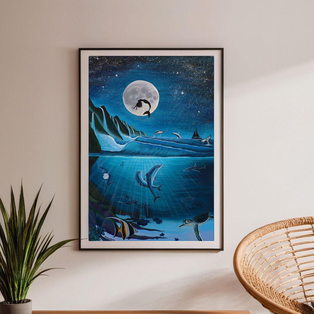 The Ocean's Moonlit Song captures a serene ocean scene under a glowing full moon. A mermaid leaps into the sky, while dolphins and sea creatures glide through the moonlit waters, evoking peace and magic in this mystical seascape.